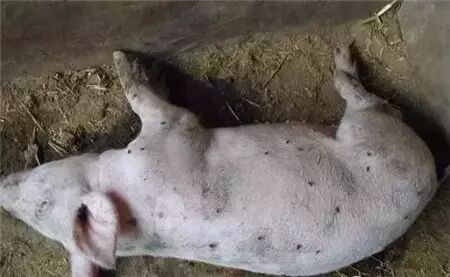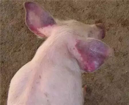 發(fā)病癥狀:病豬全身皮膚發(fā)紅,有的有出血點(diǎn),耳皮、腹下、四肢、胸膜處有充血、出血及紫色的淤血斑;出現(xiàn)高溫稽留熱現(xiàn)象的病豬站立不穩(wěn),并伴有癱瘓現(xiàn)象出現(xiàn);糞便前期干結(jié),后期腹瀉,且有水痢現(xiàn)象出現(xiàn),并具有惡臭味;病豬犬坐呼吸,口流白沫,呼吸困難,母豬有流產(chǎn)現(xiàn)象發(fā)生,病豬在患病后期會(huì)發(fā)生四肢癱瘓現(xiàn)象。