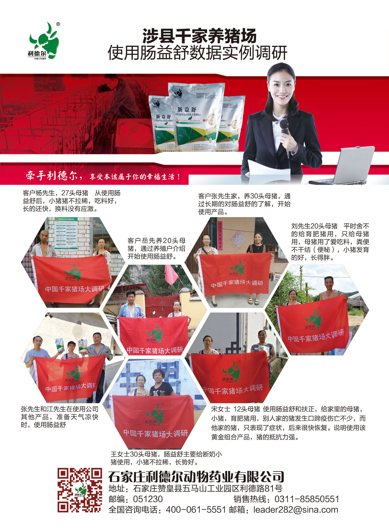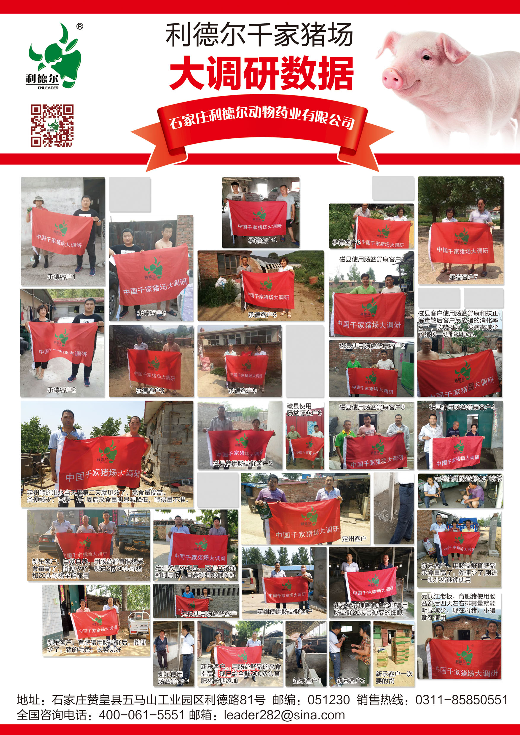 腸益舒投放市場將近半年時間,市場遍布石家莊周邊,唐山、承德,邯鄲,山東、東北,河南,廣東,福建等地,利德爾藥業(yè)本著對客戶負(fù)責(zé),對用戶負(fù)責(zé)的精神!利德爾千家豬場大調(diào)研正在進(jìn)行中,我們已經(jīng)走訪了承德,石家莊周邊和邯鄲部分縣區(qū),雖然今年的養(yǎng)豬行情不如去年,但是養(yǎng)豬戶還是很積極的在擴(kuò)建,怎樣把豬養(yǎng)好。通過市場走訪,養(yǎng)殖戶對公司的腸益舒評價非常高: