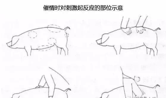 用手按摩陰戶,雙腿跪在母豬后軀,用膝蓋頂壓后軀,雙手按壓后背;