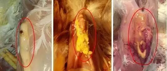 2、胸部有囊腫。病初呈淺黃色組織增生物,病程長的雞囊腫較大,可達(dá)2cm×4cm,切開內(nèi)有黃色或褐色分泌物。