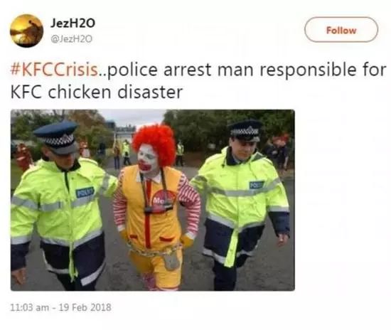還有人在網上發(fā)出警察帶走一位“麥當勞叔叔”扮演者的照片,戲稱“肯德基關門的罪魁禍首已被擋獲”。