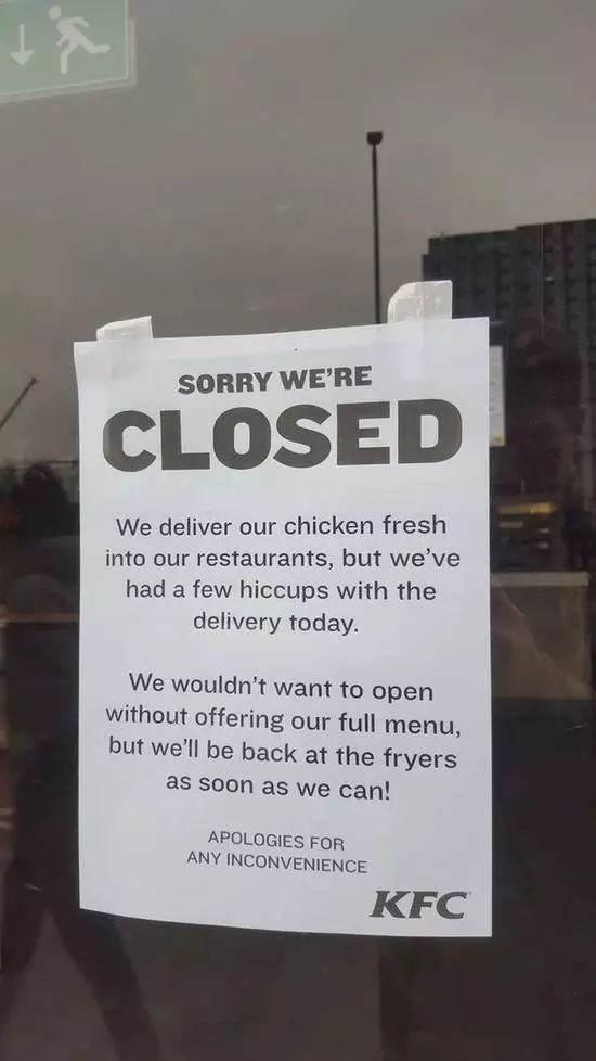 原來由于新鮮雞肉的運輸儲存出現(xiàn)重大差錯,英國全國870多家肯德基門店中一度超過700家受到影響,被迫暫時關門停業(yè)。