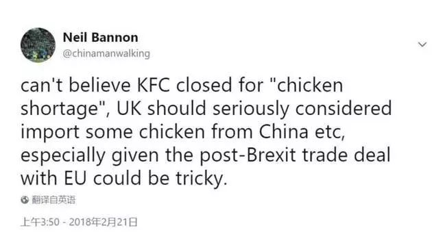 上圖為英國一位名叫尼爾·班南(個人資料認證為養(yǎng)雞場農民)的網友表示:面對雞肉供應短缺的危機,考慮到退歐之后歐盟國家的雞肉不容易出口到英國,應該未雨綢繆,積極從中國進口雞肉。