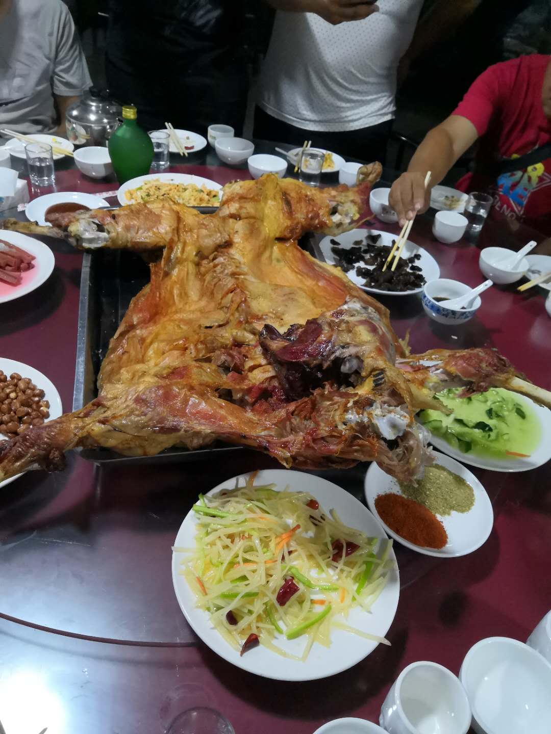 本以為已到目的地,結(jié)果還需開車繞行而上,天黑,加上下雨,車速不敢太快,沿路沒有路燈,開始進入森林地帶,真擔心,會不會從林子里跳出只“大貓”來!哈哈,開個玩笑了!大概有一個小時的行程,我們來到提前預定好的住所,香噴噴的烤全羊,已經(jīng)讓饑餓的肚子忍不住,流口水了,進入房間放下行李,稍作收拾,直奔餐廳。十多個人圍著一張大圓桌,等待店家把全羊呈上來,羊烤的外焦里嫩,不到一個小時的時間一只60斤的羊,就剩下了骨頭架子,戰(zhàn)斗力不錯吧!由于氣候涼爽,空氣清新,飯后他們又一起跑去遛彎吸氧!呵呵,精神頭十足。