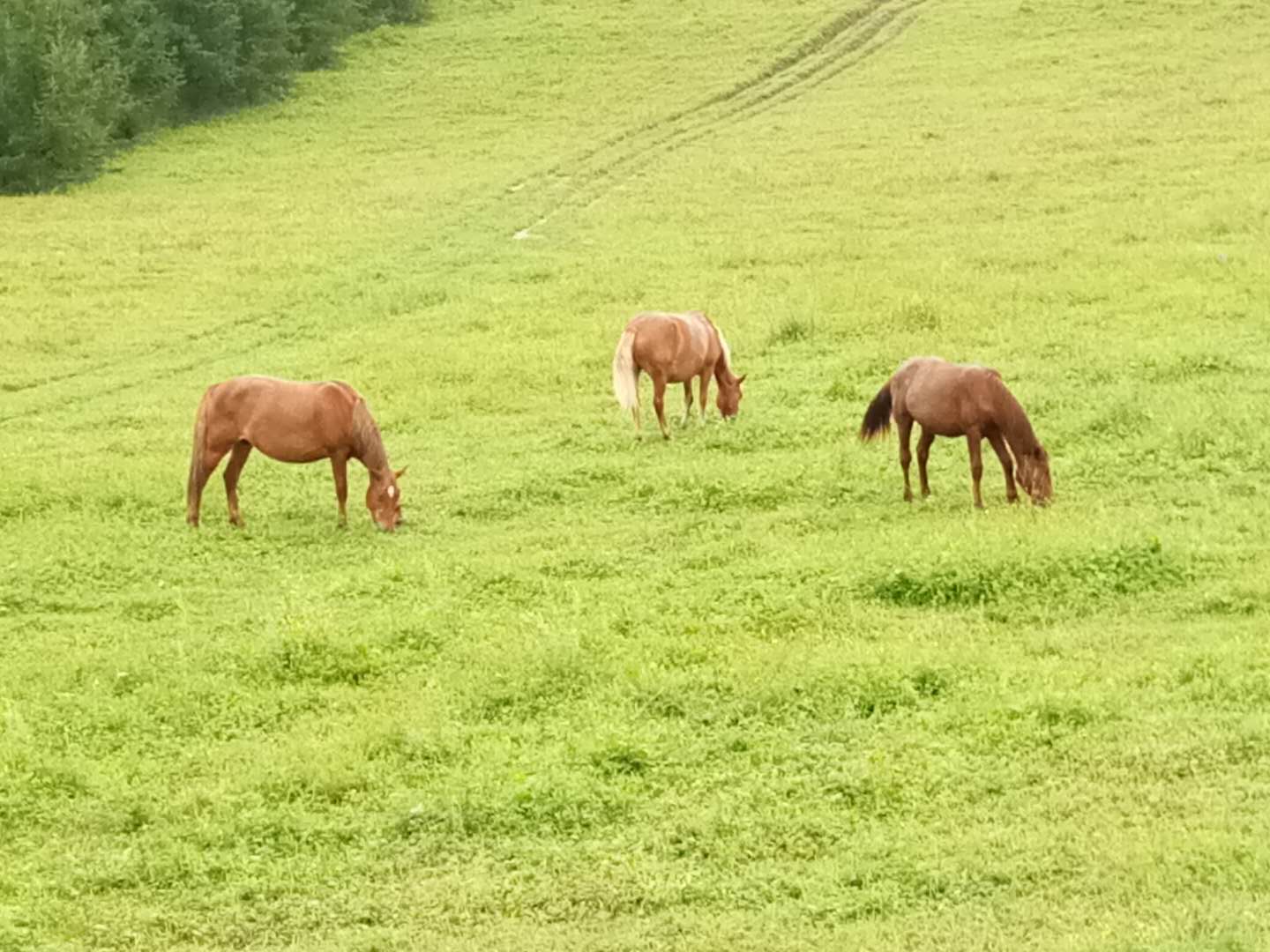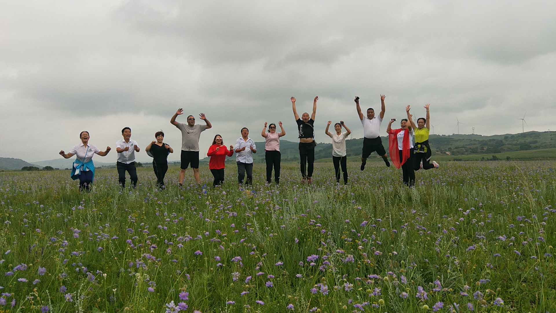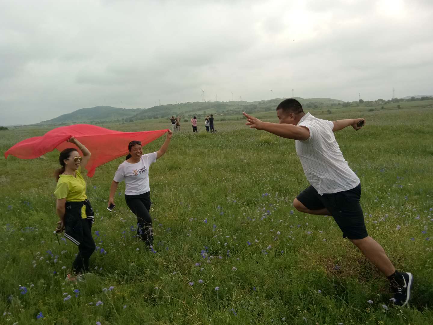 第二天,啟程直奔草原,車行駛沒有多遠,就看到了草原,路邊好多車,好多游客在駐足拍照留影,我們隨即停車。初入草原,瞬間被草原的草,草原的天,草原的花……被草原的一切吸引住了。可惜天公不作美,時不時的給我們來點小雨伴奏。進入草原各種pose拍照,跳躍的,匍匐的,跑著的,感覺一切都是那么的美!