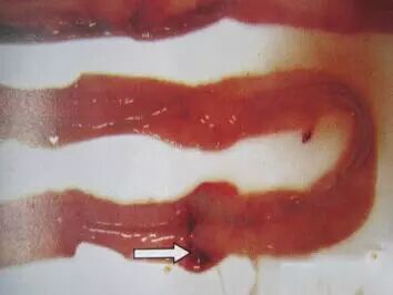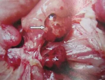 心冠脂肪出血,心肌變性。十二指腸、空腸、回腸出血、壞死,結(jié)腸見豆?fàn)畲笮儭?/span>