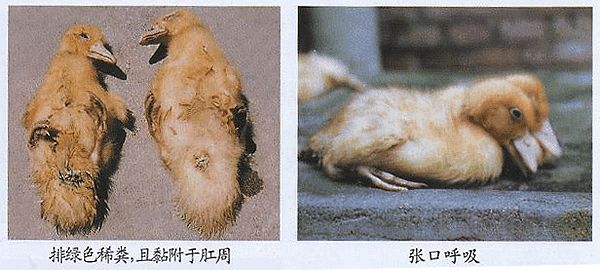 病初病鴨食欲減少,羽毛松亂,飲水增加,縮頸,兩腿無力,孤立一旁或癱瘓。羽毛缺乏油脂,易附著污物。開始排白色稀糞,中期糞便轉(zhuǎn)紅色,后期呈綠色或黑色。部分病鴨,呼吸困難,甩頭,口中有粘液蓄積。有些病鴨出現(xiàn)轉(zhuǎn)圈或向后仰等神經(jīng)病狀。