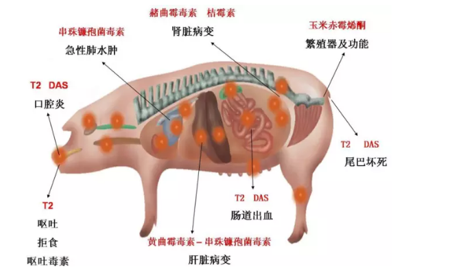 如果在一個豬場同時出現(xiàn)以下幾種或所有的癥狀,可以確診為霉菌毒素中毒,并結合飼料檢查和治療從而最終確診。