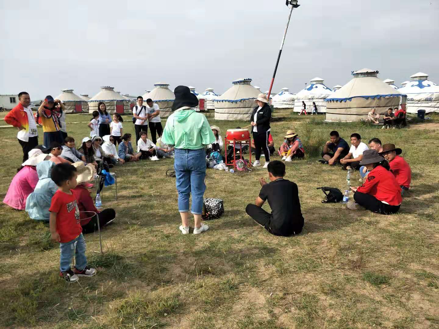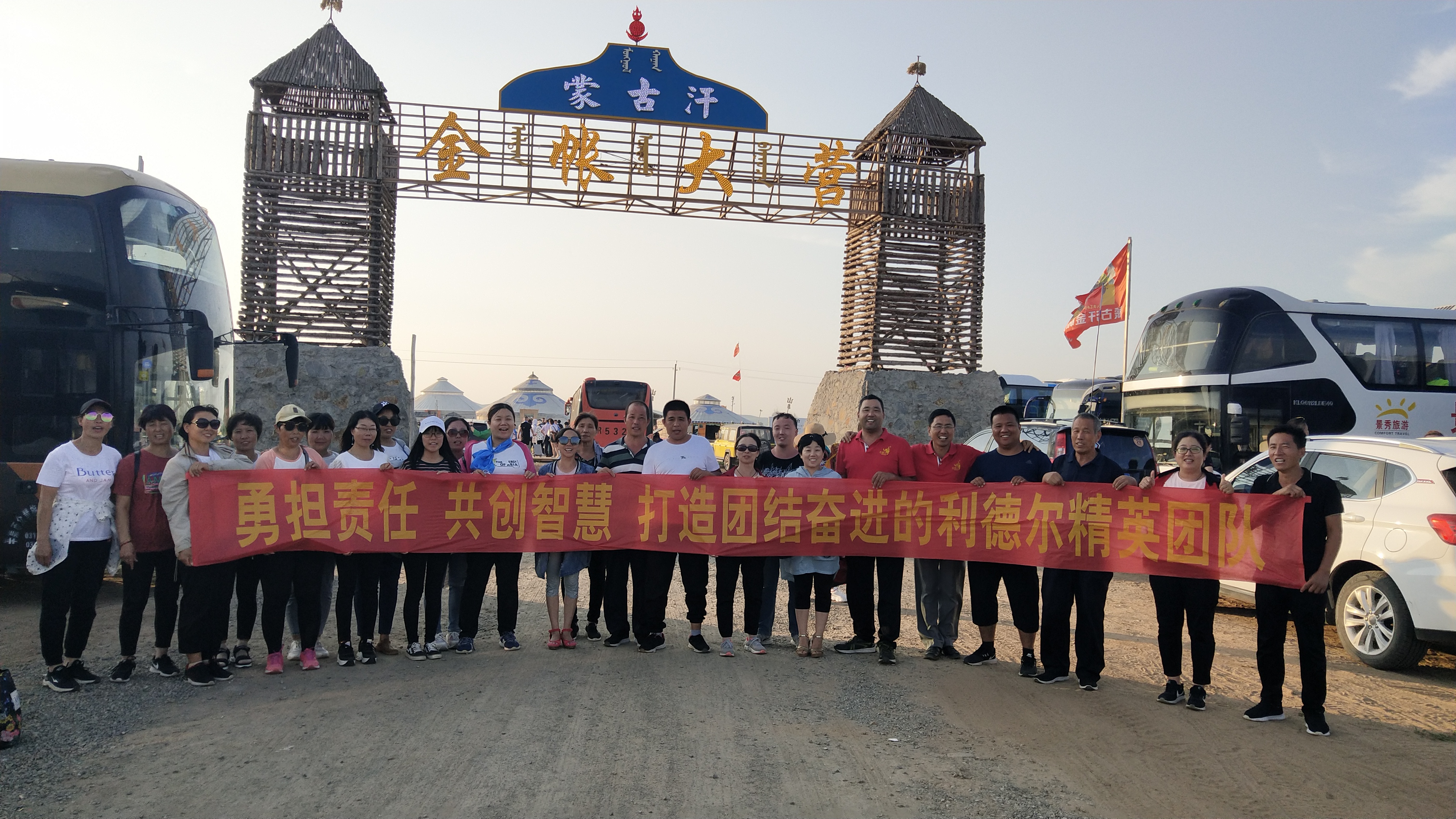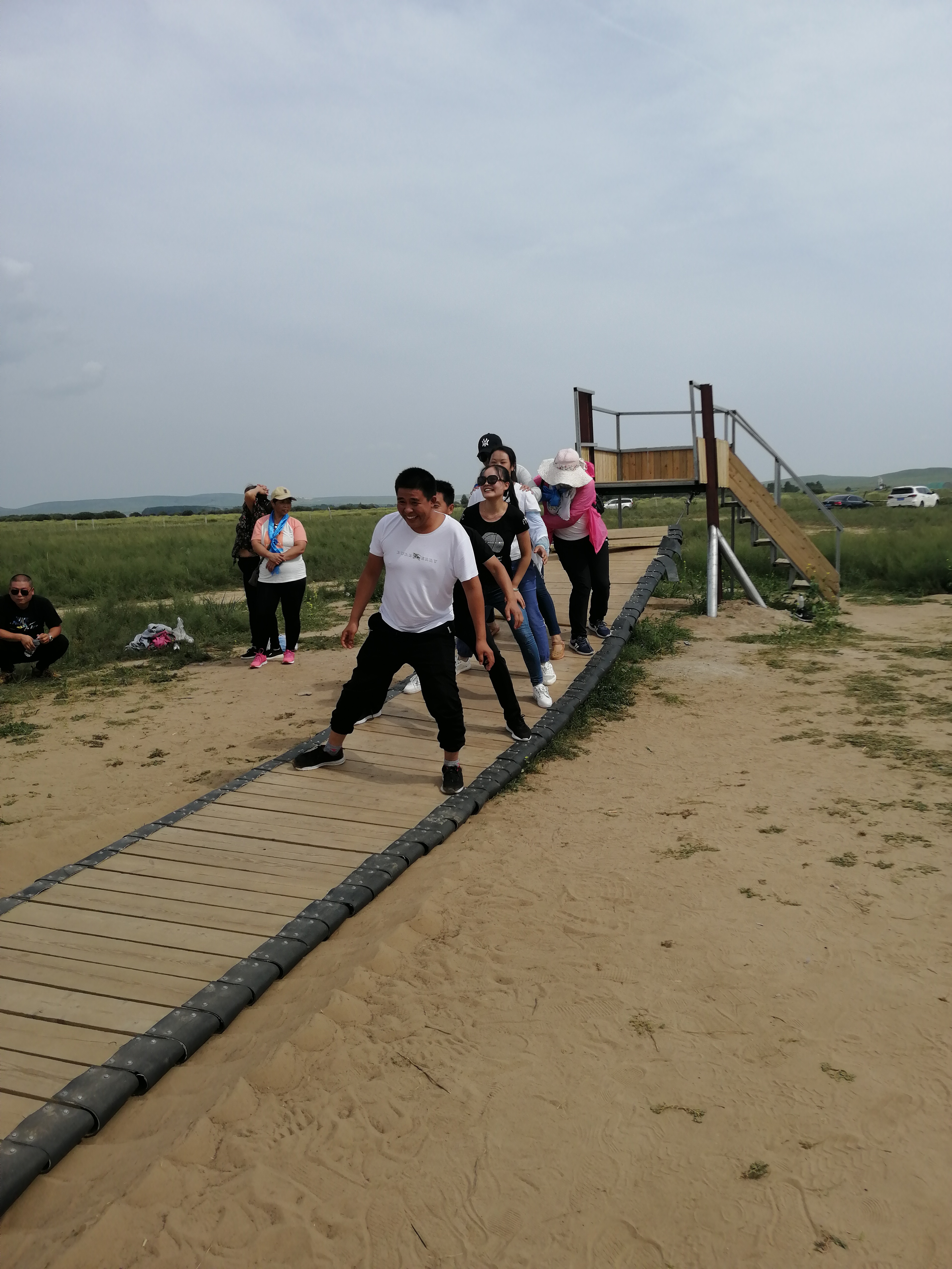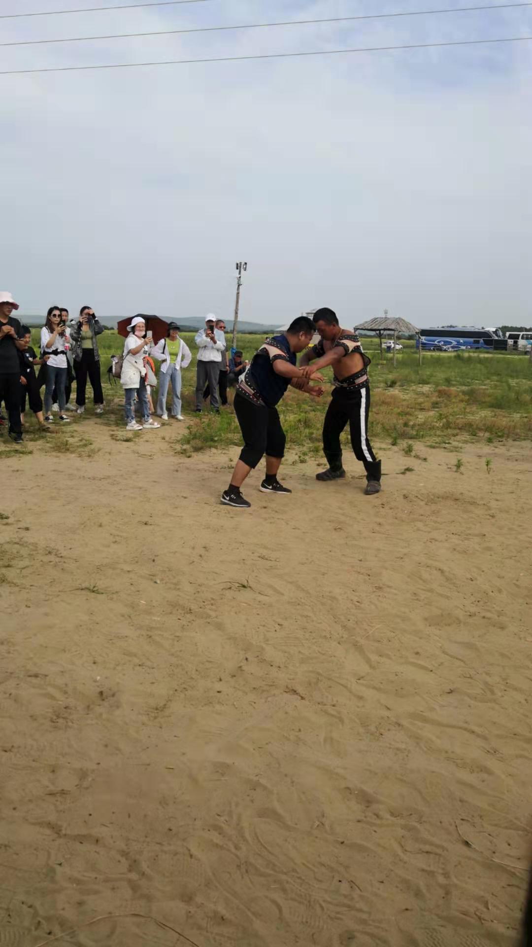 中午抵達(dá)蒙古大營(yíng),途徑忽必烈影視城和梳妝樓,盛裝熱情的草原小伙策馬揚(yáng)鞭,遠(yuǎn)遠(yuǎn)的迎著我們的車過來,為我們接風(fēng)洗塵,獻(xiàn)上哈達(dá)和下馬酒。中午品嘗草原的蝎子骨莜面宴,營(yíng)地里的項(xiàng)目比較多,騎馬的驚魂,摔跤感受蒙古人彪悍,眾人蕩沙橋的刺激,步調(diào)不一致,便會(huì)被掉下橋,射箭,穿蒙古民族服拍照等,感受蒙古的文化氣息。我們來的時(shí)候自備了繩子和大鼓等裝備,拔河比賽,尤其于廠長(zhǎng)老當(dāng)益壯,也不示弱參其中,在呼喊口號(hào)聲中使勁全身力氣,整個(gè)隊(duì)伍,身體向后傾斜。擊鼓傳花,在鼓聲中花兒在每個(gè)人的手中飛舞傳遞,就像一塊燙手的山芋,趕緊的拋給下一個(gè)人,鼓;湔l家,就表演一個(gè)節(jié)目了,好多游客過來圍觀,有的游客也參與進(jìn)來和我們一起進(jìn)行游戲,踩氣球等。晚上觀看名族演出和篝火晚會(huì)。讓您忘記城的喧囂與疲憊,感受草原的廣闊與放縱。