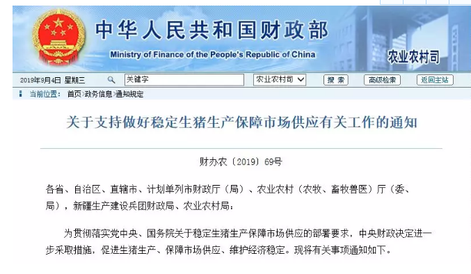9月3日,財(cái)政部、農(nóng)業(yè)農(nóng)村部聯(lián)合發(fā)布《關(guān)于支持做好穩(wěn)定生豬生產(chǎn)保障市場(chǎng)供應(yīng)有關(guān)工作的通知》,通知如下: