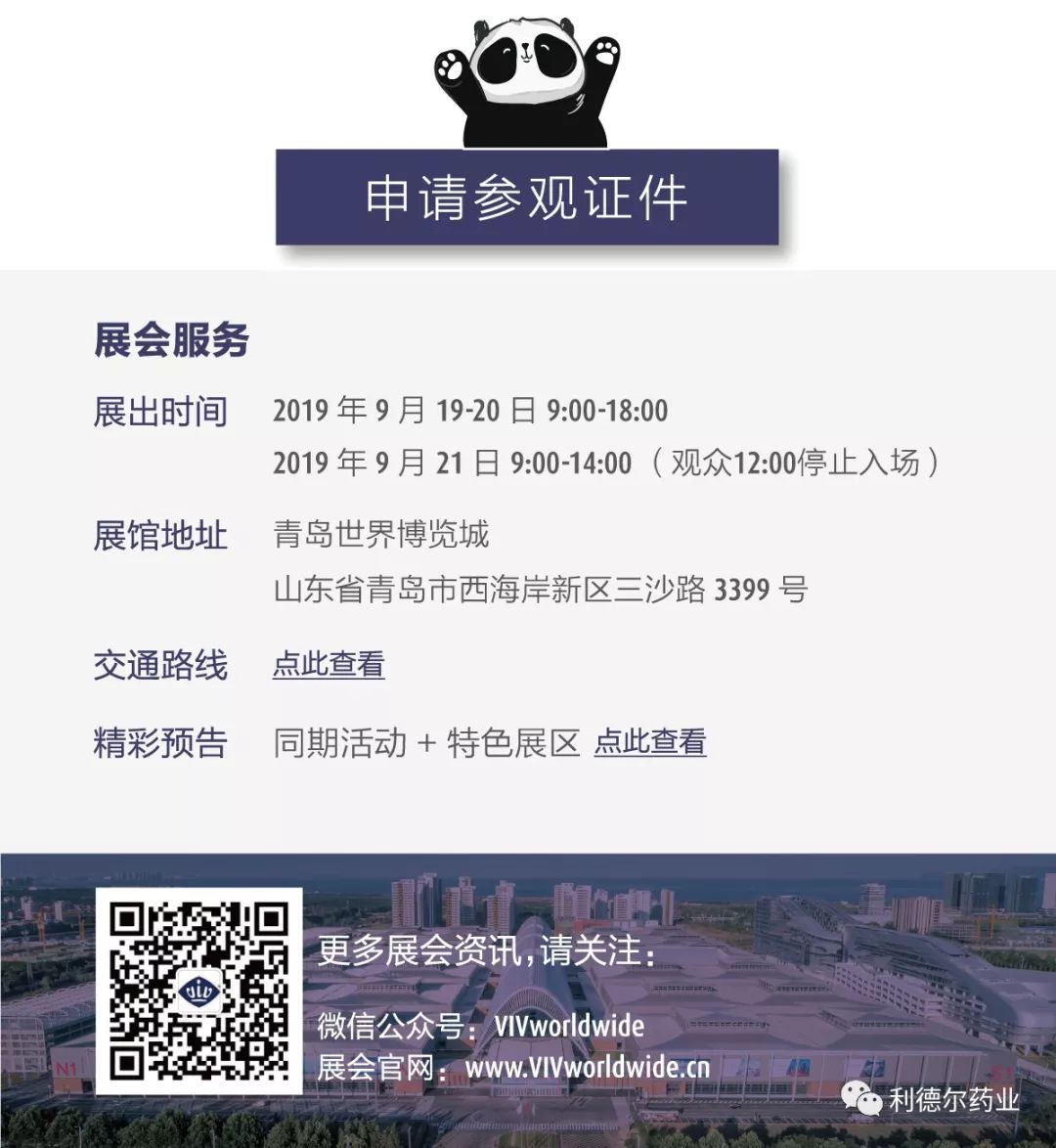 您好!石家莊利德?tīng)杽?dòng)物藥業(yè)有限公司 誠(chéng)摯邀請(qǐng)您于 9 月 19-21 日赴 VIV Qingdao 2019 亞洲國(guó)際集約化畜牧展(青島)現(xiàn)場(chǎng)參觀。共聚青島西海岸,聯(lián)動(dòng)全球話(huà)畜牧。展位號(hào):S3F016 現(xiàn)場(chǎng)更有精美小禮品,期待您的光臨!