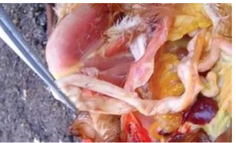 解剖不產(chǎn)蛋雞只,主要表現(xiàn)輸卵管前段或中段管壁變薄、管腔內(nèi)積有多量清亮液體、中段變細(xì)充血;或輸卵管整體發(fā)育不良或沒(méi)有發(fā)育。其它實(shí)質(zhì)器官包括卵巢均無(wú)異常變化。