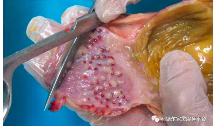 9、卡氏住白細(xì)胞原蟲病:又稱白冠病,雞冠上有針尖狀出血點(diǎn),胸肌、腸漿膜、腸系膜、心外膜、腎臟、肺臟等處出血,有的出血點(diǎn)中心有灰白色小點(diǎn)(巨型裂殖體),嚴(yán)重時(shí)腎臟被膜下有大血皰,還會(huì)發(fā)生便血或咯血;