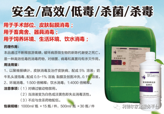 2、福碘欣(聚維酮碘溶液),通過不斷釋放游離碘,作用于病菌的蛋白質,破壞病原微生物的新陳代謝使之死亡,是一種高效低毒的消毒藥物,對細菌、病毒和真菌均有殺滅作用。具有使用安全,能用于皮膚和黏膜,作用持久等優(yōu)勢,適用于舍內外和飲水的消毒。