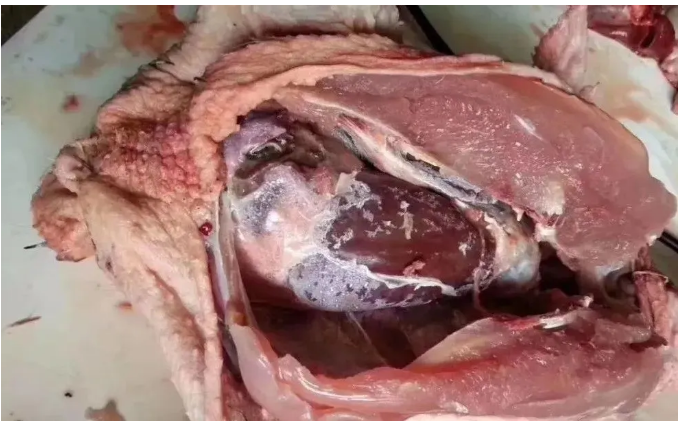 (1)診斷順序:脾臟壞死,出現(xiàn)凸起的增生性炎癥,感染脾臟周圍的漿膜發(fā)生炎癥,出現(xiàn)兩個方向的炎癥蔓延矢量,一為向胸氣囊發(fā)展,二為向腹氣囊發(fā)展,最后出現(xiàn)包心包肝的嚴重病變。